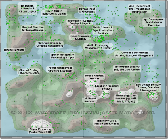 The figure below shows a ‘ThemeScape map’ constructed from the patent families in the set described in Part III.- moving from north to south, and east to west, corresponds with a transition from principally software-based systems and applications to low-level hardware and communications components, via interfaces between software, hardware and users;